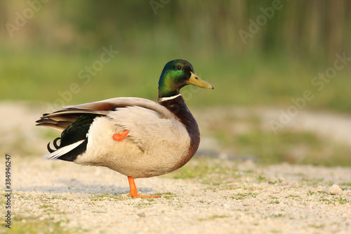 Colorful male mallard (Anas platyrhynchos) resting on one foot
