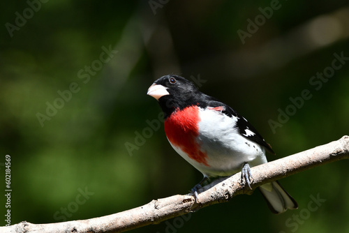 Colorful male Rose Breasted Grosbeak bird perched on a branch