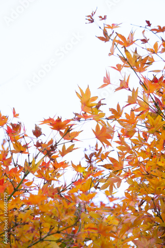 Colorful Maple leaves on the branches in fall season are on the white cloudy sky