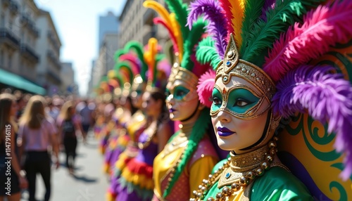 mardi gras, carnival, parade, performer, masked, colourful, vibrant, feather, festival, celebration, street, costume, bead, joyful, lively, artistic, downtown, urban, cultural, female, tradition, bright, sunny, festive, event, ornate, mask, brazil, samba, dancer, elaborate, expressive, culture, community, fun, gathering