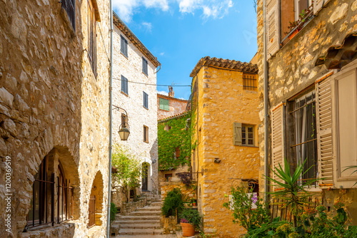 Colorful medieval stone buildings along the Grand Rue main street through the hilltop village of Tourrettes-sur-Loup, France, in the Alpes-Maritimes region of Southern France.