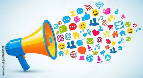 megaphone, social, media, communication, digital, icon, cyberspace, broadcast, colourful, online, technology, marketing, promotion, engagement, sharing, connection, user, profile, message, comment, like, symbol, community, platform, network, virtual, interaction, information, content, advertising, achieving, audience