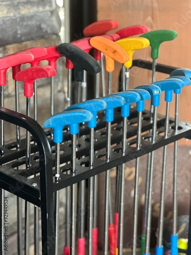 Colorful mini golf clubs in rack