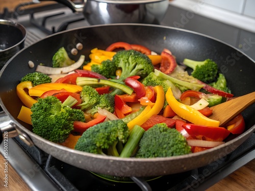 vegetable, stir fry, cooking, broccoli, bell pepper, red pepper, yellow pepper, courgette, onion, health food, vegetarian, vegan, food preparation, kitchen, frying pan, fresh vegetable, colourful, dinner, lunch, side dish, ingredient, culinary, home cooking, organic, diet, nourishment, appetising, food photography, closeup, gas-stove