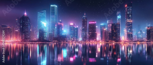 city, urban, night, skyline, futuristic, skyscraper, city landscape, science fiction, modern, glowing, building, digital, metropolis, nightlife, nightscape, stunning, travel, vibrant, reflect, river, water, mirror, illuminated, colours, light, sky, architecture, scene, traffic, neon, bustling, energy, cyberspace, technology, background, silhouette, cyber, banner, abstract, hologram, dark, blue, landscape, future, fantasy, surreal, design, downtown