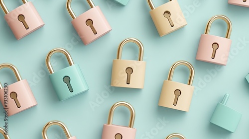 Colorful multicolored padlocks arranged artistically on a bright surface showcasing a vibrant pattern in a playful exploration of security concepts