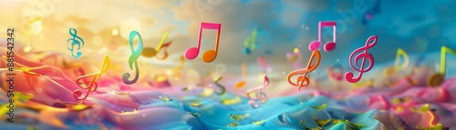 Colorful Music Notes Floating in a Dreamlike Landscape - A colorful and vibrant illustration featuring music notes floating in a dreamy landscape. The notes are arranged in a way that suggests a music