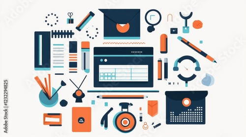 Colorful Office Supplies and Tools on a Desktop Workspace Layout