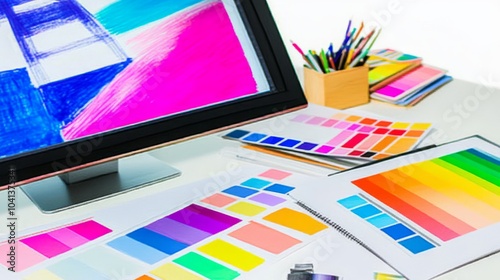 colours, design, palette, swatch, screen, monitor, display, desk, computer, digital, art, graphic, graphic, artist, illustration, paint, creative, studio, workspace, tool, technology, paper, inspiration, drawing, designing, colourful, vibrant, hue, tone, shades, pattern, textured, white, background, surface, professional, professionalism, composition, work, office, business