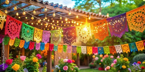 Colorful papel picado hanging from a gazebo or patio, its vibrant flowers and leaves dancing in the breeze on a sunny Cinco De Mayo celebration, string lights, fiesta decor