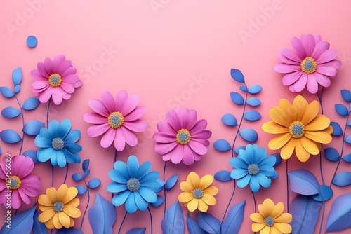 Colorful paper flowers arranged artistically on a pink background create a vibrant and cheerful atmosphere in springtime