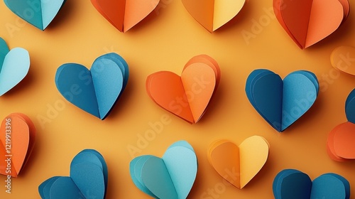 Colorful paper hearts on an orange background create a playful and festive atmosphere., Valentine day concept