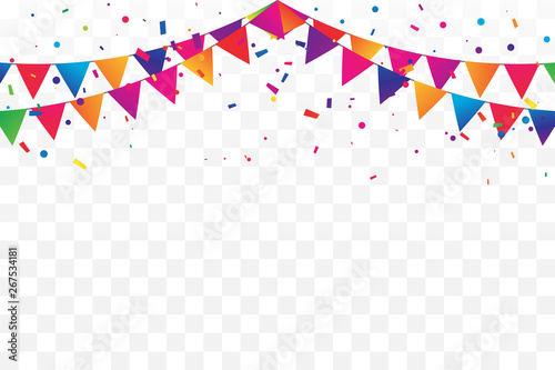 Colorful Party Flags With Confetti Falling On Transparent Background. Celebration Event & Birthday. Multicolored. Vector