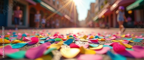 Colorful petal confetti scattered on the street during a festive celebration, warm sunlight