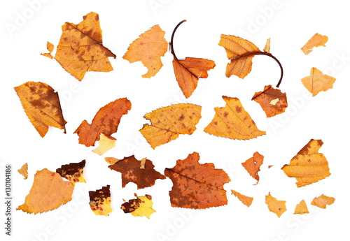 colorful pieces leaves isolated on white background, autumn texture