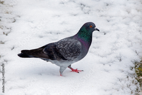 Colorful pigeon (Columba livia) looking for food into the snow in Athens, Greece.