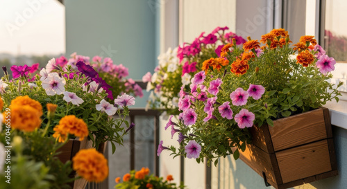 Colorful pink and orange petunias bloom vibrantly in wooden flower boxes on apartment balcony railings, brightening modern residential exterior during sunset