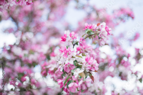 Colorful pink bud of flowers in blossom on spring tree in park. Nature, summer, macro, flowers concept