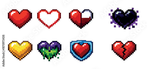 pixel, art, heart, colourful, collection, design, effect, red, black, yellow, purple, green, shield, broken, love, digital, gaming, retro, style, graphic, icon, cartoon, vibrant, glowing, pixelated, creative, unique, set, decoration, symbol, emotion, fun, playful, diverse, design, aesthetic, pattern, artistic, bright, striking, imaginative, modern, variety, detailed, visual, classic
