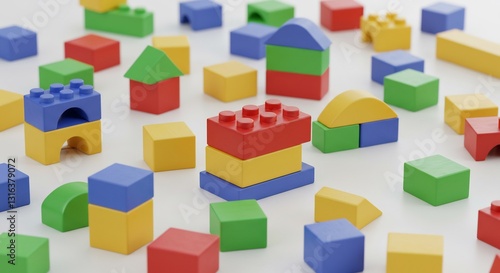 Colorful plastic blocks playfully scattered brightly lit surface. AI Generated