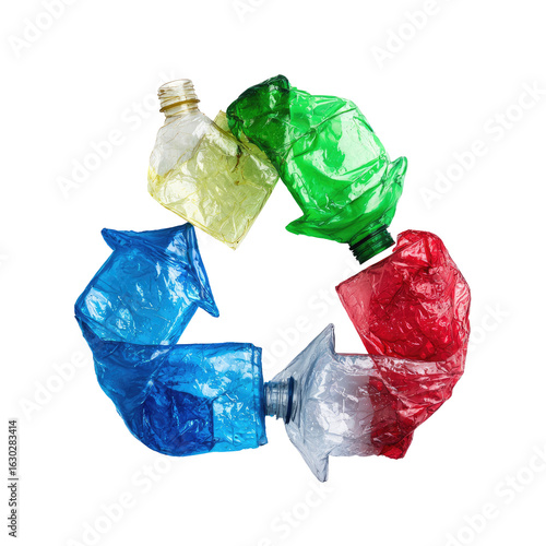 recycling, plastic, waste, environment, sustainability, garbage, reuse, reusing, circular, symbol, arrow, bottle, container, green, blue, red, yellow, colours, crumpled, deformed, material, pollution, conservation, reduce, transformation, ecological, sustainable, resource, management, reuse, manufacturing, design, graphic, image, illustration, concept, conservationist, problem, solution, impact, future, economy, reduction, responsibility, planet, preservation, awareness