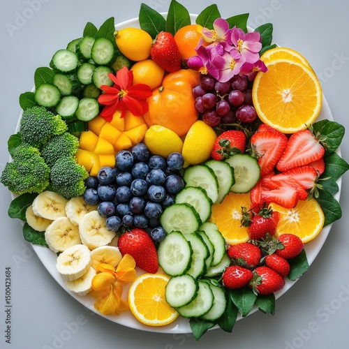 fruit, vegetable, platter, healthy, vibrant, colourful, fresh, sliced, arrangement, delicious, diet, alimentary, balanced, plate, food, display, cucumber, orange, lemon, strawberry, banana, grape, mango, broccoli, blueberry, tomatoes, floral, design, composition, nourishment, wellness, dietitian, vegan, vegetarian, tasty, summer, seasonal, vitamin, antioxidant, freshness, clean, organic