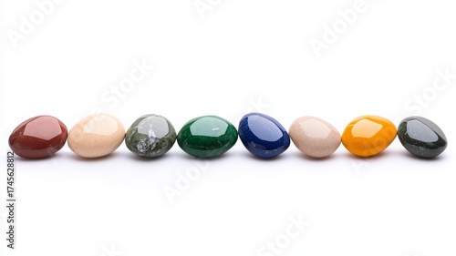 Colorful polished stone collection arranged in row on white background, smooth and shiny surface