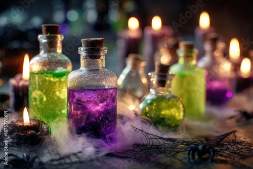 Colorful potions in glass bottles sit on a wooden table surrounded by flickering candles, cobwebs, and a spooky ambiance perfect for Halloween festivities in autumn