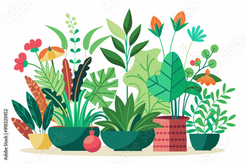 pot, plant, leaf, green, flower, red, orange, yellow, brown, pattern, foliage, floral, houseplant, decoration, nature, vibrant, colourful, illustration, graphic, design, artwork, art, style, modern, minimal, simple, botanical, indoor, beauty, life, growth, bright, shape, collection, variety, arrangement, tropical, exotic, fresh, lush, decorative, room, home, garden