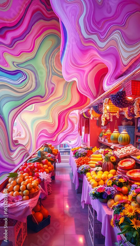 vibrant, colourful, market, fruit, vegetable, pink, purple, orange, green, yellow, abstract, surreal, hallucinogen, texture, pattern, digital artwork, illustration, fantasy, dreamlike, background, fruit, racked, food, produce, bright, colours, flowing, pattern, swirling, painting, whimsical, artistic, creative, modern, contemporary, design, stall, display, street, decoration