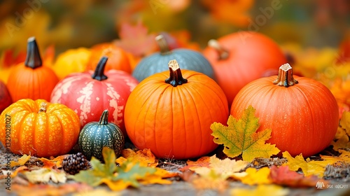Colorful pumpkins and gourds on autumn leaves.