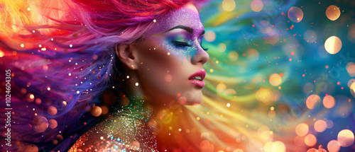 Colorful rainbow artistic makeup with glitter and vibrant bokeh background