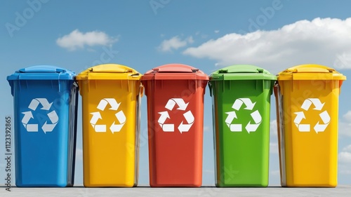 Colorful recycling bins arranged neatly against a blue sky, promoting eco-friendly waste management and sustainability.