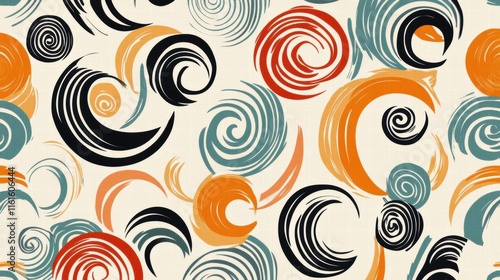 Colorful retro pattern features spirals and curved lines in vibrant 70s hues creating a lively and energetic design. Generative AI