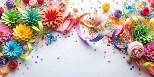 Colorful ribbons and confetti scattered on a white background with a subtle gradient effect , paper flowers, festive atmosphere