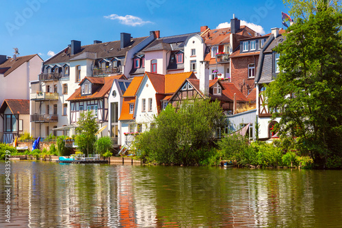 Colorful riverside houses along the Lahn River in Marburg, Germany, on a sunny summer day