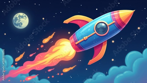 cloud, take-off, moon, bright, digital, flight, colourful, creative, high-coloured, spacecraft, launch, star, rocket, vibrant, flames, design, journey, bold, beautiful, space, night, sky, illustration, imagination, animation, graphic, cartoon, adventure, dreamy, art, fantasy, fire