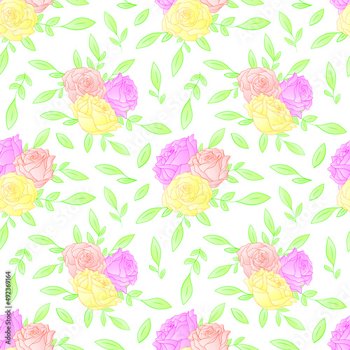 Colorful roses seamless pattern on white background. Vector illustration.