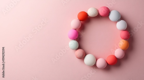 Colorful round objects arranged in circle on pink background