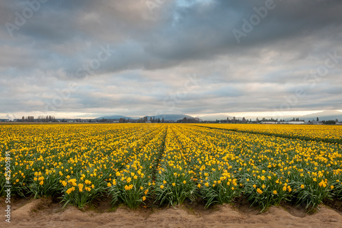 Colorful Rows of Bright Yellow Daffodils Growing in the Skagit Valley. The fields of Skagit County burst into bloom with daffodils, a month ahead of the more famous tulips.