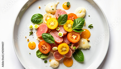 Colorful salad with tomatoes and basil on white plate