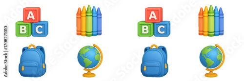 Colorful school supplies with ABC blocks, crayons, blue backpack, and world globe, symbolizing education and learning