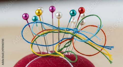 sewing, pin, thread, colourful, needlecraft, craft, pincushion, red, threaded, fabric, design, pattern, hand-made, art, accessory, tool, equipment, detail, closeup, colours, bright, material, textile, needle, work, hobby, craft, sewing kit, supply