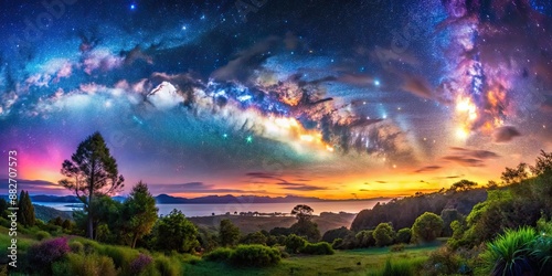 Colorful sky and natural panoramic view with stars and lush vegetation , colorful, sky, natural, panoramic, stars, vegetation