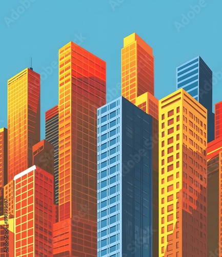 city, skyline, building, skyscraper, illustration, architecture, urban, modern, colourful, design, background, graphic, art, vector, abstract, style, geometric, concept, pattern, texture, blue, yellow, orange, red, green, sunset, sunrise, light, shadow