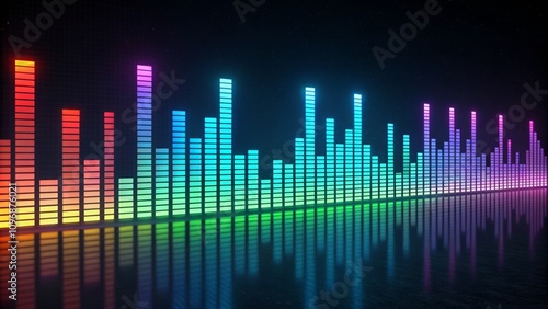Colorful sound wave display with vibrant bars reflecting on a surface at night