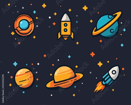 space, planet, rocket, star, galaxy, illustration, vibrant, colourful, cosmic, astronomy, exploration, science, adventure, universe, outer, celestial, neon, fantasy, creative, design, graphic, modern, art, fun, technology, imagination, motion, travel, discover, children, playful, cartoon, creativity, deep, starry, night, solar, system, futuristic, cartoonish, bright, colours, style, animation, stylised