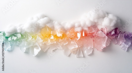 Colorful spectrum of rainbow crystals with soft cloud accents on white background