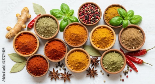 Colorful spices and herbs in wooden bowls with ginger, basil, and peppers on a white background