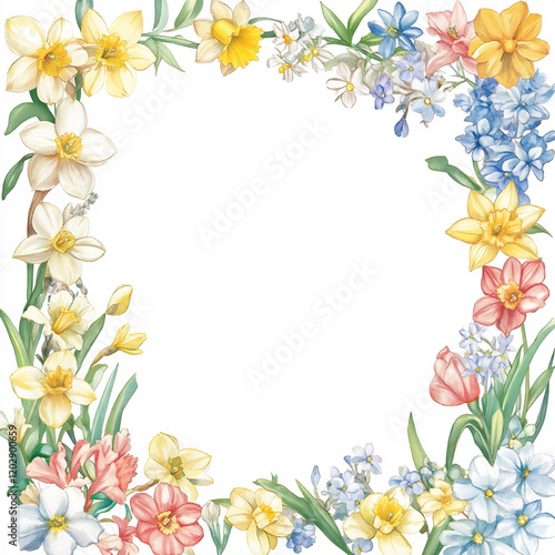 spring, flower, daffodil, tulip, border, colourful, bloom, floral, pastel, nature, gardening, seasonal, decoration, beauty, creativity, art, design, illustration, garden, flower petals, leaf, vibrant, growth, sunlight, fresh, bouquet, cheerful, soft, bright, springtime, serenity, warmth, natural, blossom, variety, landscape, greenery, freshness